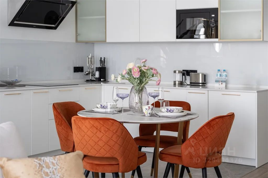 — мягкая зона отдыха с диваном и креслами насыщенного терракотового цвета — идеальный контраст с общей светлой гаммой интерьера.