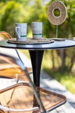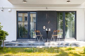 Студия находится в новом небольшом жилом комплексе на первом этаже. Из панорамного окна выход прямо на приусадебный участок, со столиком и стульями для утреннего завтрака и вечернего романтического ужина на свежем морском воздухе.