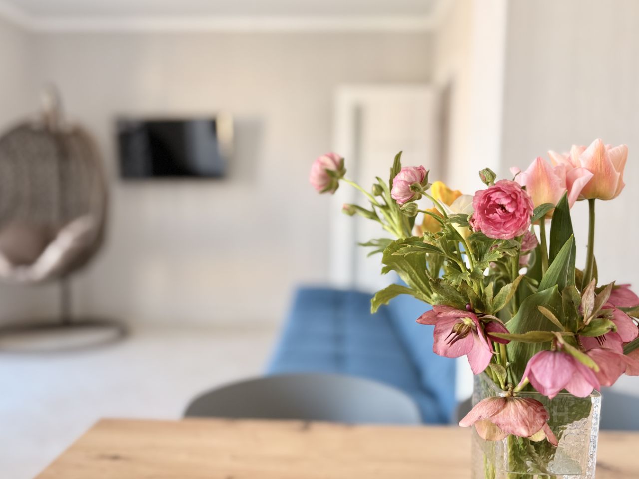 В апартаментах предумсотрено все для комфортного проживания четырех человек - современная и качественная отделка, удобные места для отдыха и сна: двухспальная кровать с ортопедическим матрасом высокого качества в спальне, раскладной диван в просторной кухне-гостиной, пуф и подвесное кресло Капля для отдыха.