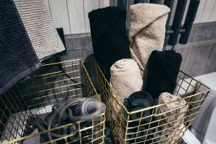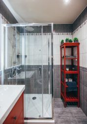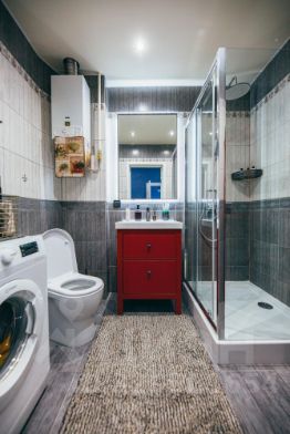 Совмещённый санузел с душевой кабиной и тропическим душем, стиральная машина, электрический полотенцесушитель, фен, полотенца, средства гигиены (зубная щётка и паста, шампунь, гель для душа, мыло, туалетная бумага).