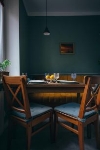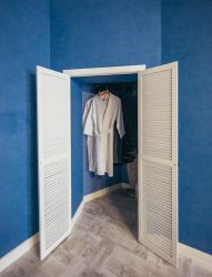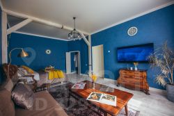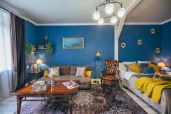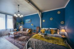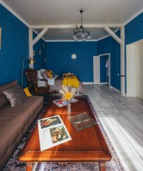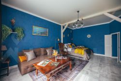 Просторная комната - гостиная оборудована современной двуспальной кроватью с ортопедическим матрасом, винтажной мебелью, раскладным диваном (дополнительное спальное место для 2-х человек), небольшим, но вместительным гардеробом, Smart ТВ с большой диагональю. Шторы блэкаут обеспечат комфортную темноту для спокойного сна.