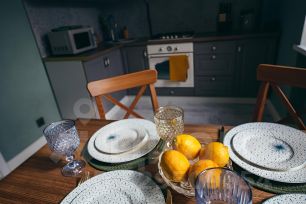 Холодильник с морозильной камерой, микроволновая печь, электрочайник, варочная поверхность и духовой шкаф, посуда и столовые приборы, обеденный стол со стульями, раскладным диваном (дополнительное изолированное спальное место для 1 человека или 2 детей).