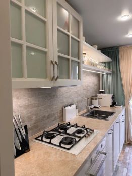 Из бытовой техники: кофемашина Delonghi, холодильник, микроволновая печь, чайник, посудомоечная машина, стиральная машина, газовая варочная поверхность, духовой шкаф, робот пылесос, утюг, 2 телевизора смарт тв, 2 кондиционера, wi-fi, фен, утюжок для волос