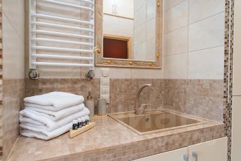 Гостям бесплатно предоставляется постельное бельё (белый страйп-сатин класса LUX), полотенца, чай, кофе, необходимые продукты (сахар, соль, растительное масло), зубная щётка, бритва, вся необходимая косметика (гель для душа, шампунь, кондиционер для волос, лосьон для тела, косметический набор), халаты, тапки.