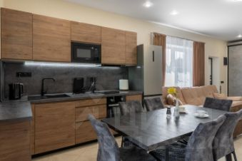 Дом оснащен новой бытовой техникой и всем необходимым для комфортного отдыха: стиральная машина, холодильник, электро плита, посуда, фен, утюг и пр.