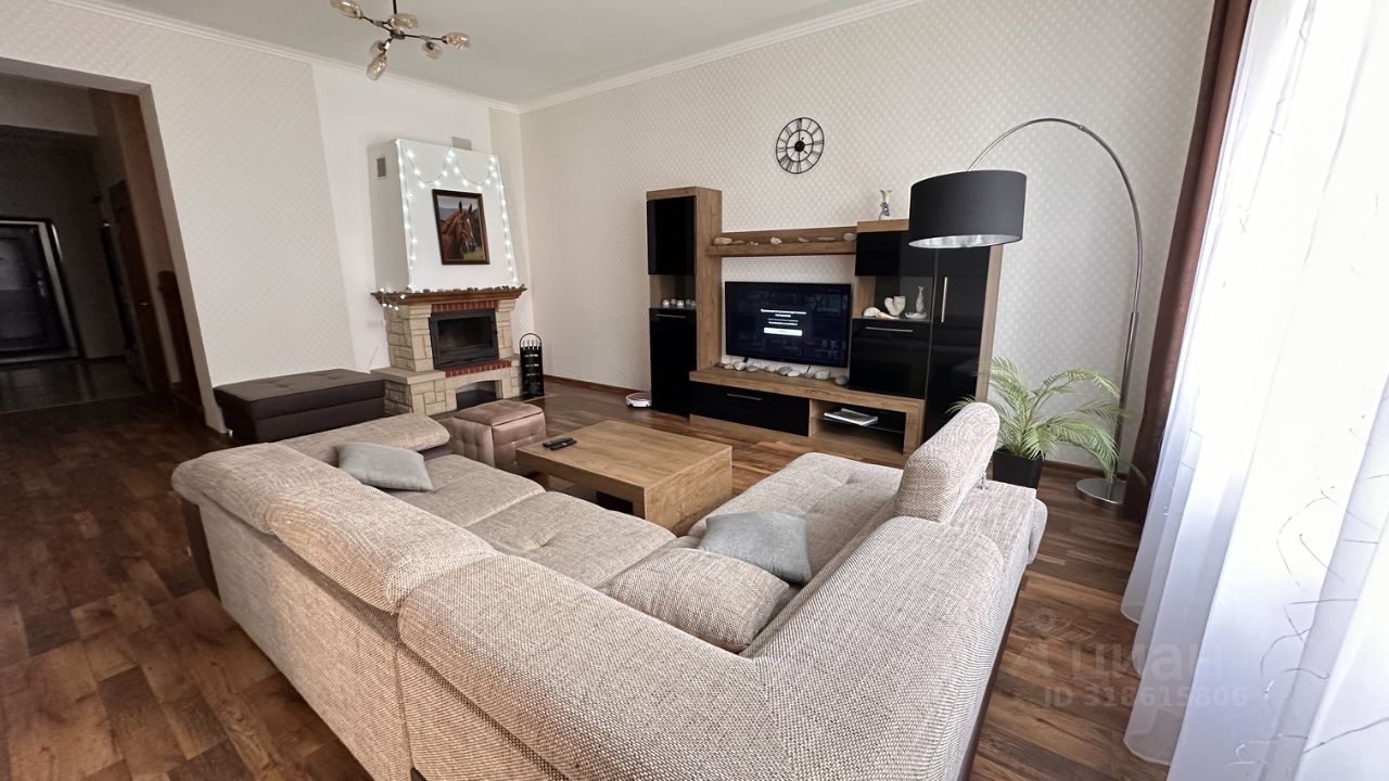 В гостиной - большой угловой диван, журнальный стол, большая банкетка, гостиный уголок, телевизор, дровяной камин