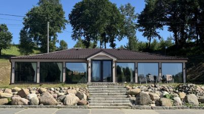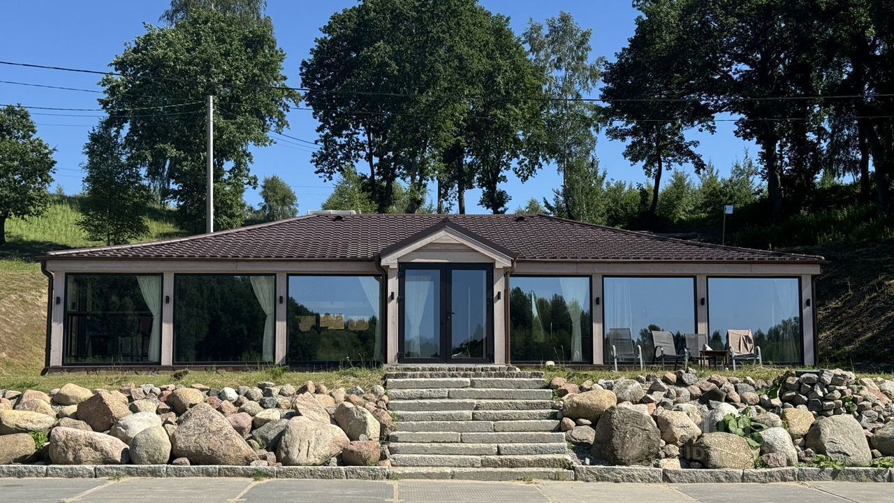 На берегу лесного озера, где вода сливается с небом в бескрайнем зеркале, мы построили красивый дом, будто сотканный из света и воздуха. Его фасад, выполненный из натурального дерева, мягко гармонирует с окружающим пейзажем, а огромные панорамные окна на три стороны дома стирают границу между интерьером и природой.