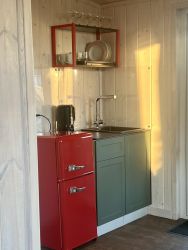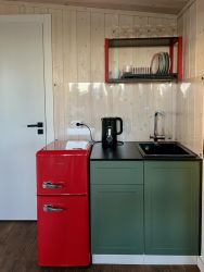 Кухонная зона с холодильником, морозильной камерой, фильтром для питьевой воды, электрической плитой , чайником, посудой, кухонными принадлежностями;