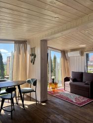 Уютный дом с панорамными окнами и видом на сад рассчитан на круглогодичное проживание. Современный, новый, стильный, есть все необходимое для комфортной жизни и отдыха. Находится в комплексе из 2х домов, приватной зоны спа (бани и банного чана) на закрытой территории 8 соток. Есть возможность аренды всего комплекса целиком. Не сдаем дом шумным компаниям. Подойдет для семейного отдыха с возможностью размещения 3-4 человек.