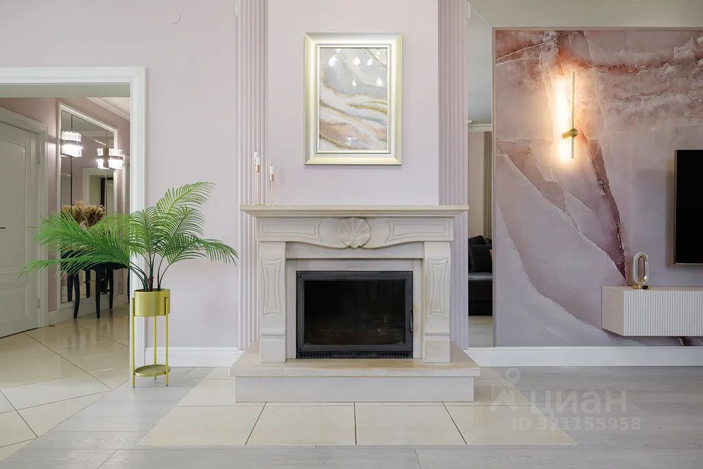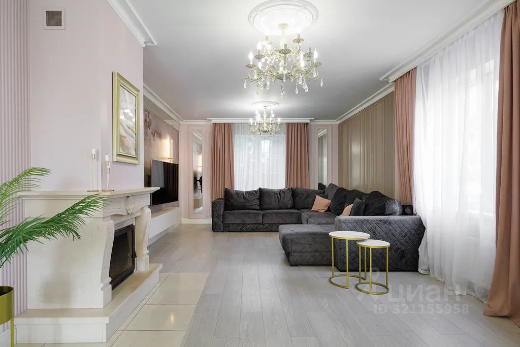 Просторная гостиная с камином, тв-зоной и огромным диваном