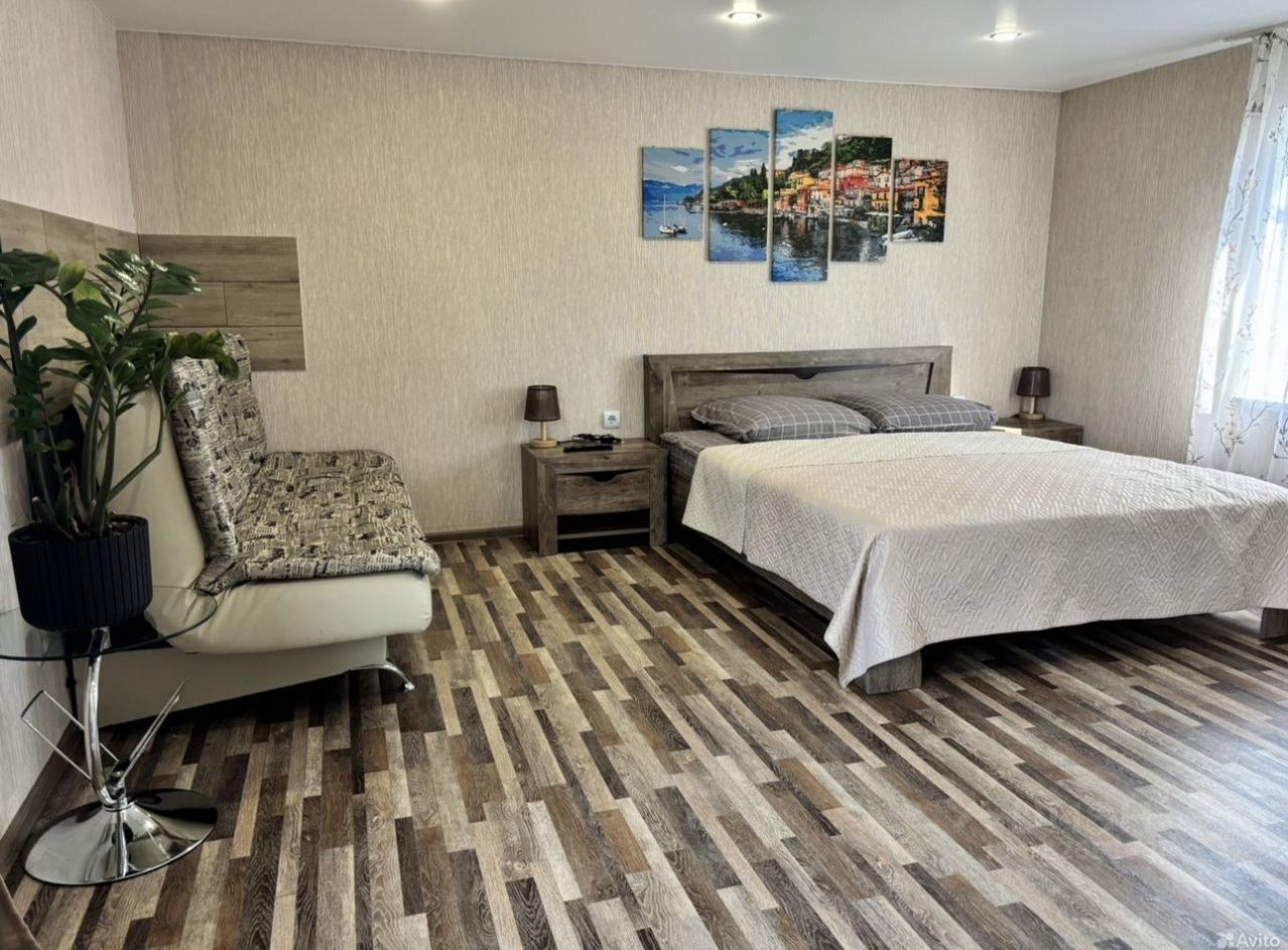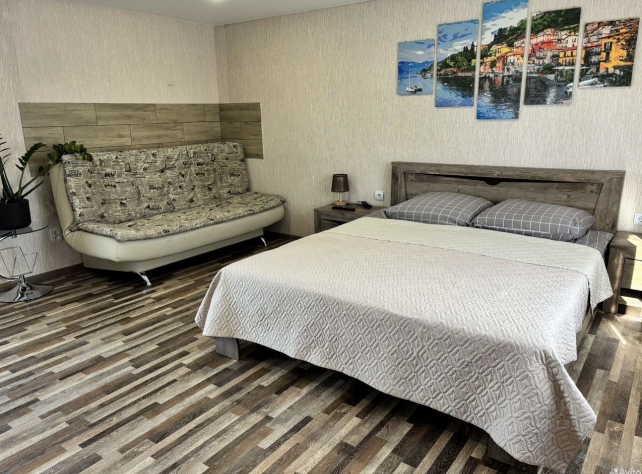 На втором этаже спальная комната с большой кроватью и раскладывающимся диваном, телевизор.