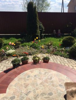 Паркинг возле дома за огороженной территорией. Территория с декоративными кустарниками и декором.