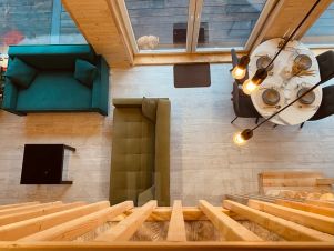 Первый этаж гостиная с раскладными диванами, кухня и изолированная спальня с дверью на улицу, второй этаж открытый с двуспальным матрасом.