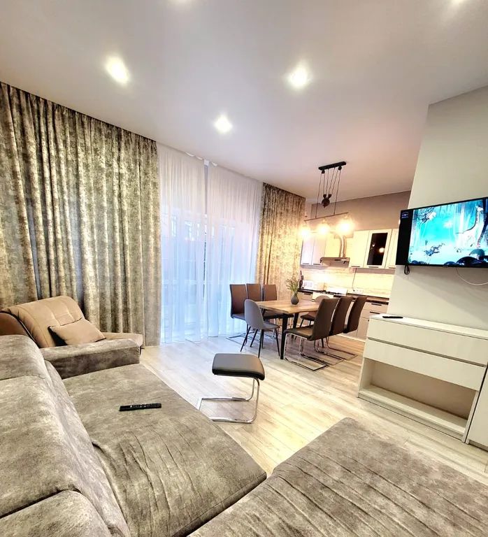 На первом этаже дома есть просторная гостиная- столовая и общая кухня. Здесь можно приготовить полноценную еду на плите в любое время.