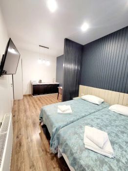 Во всех комнатах есть индивидуальный и просторный сан узел (туалет и душ). Две односпальные кровати. В семейных номерах дополнительно размещен диван-кровать.