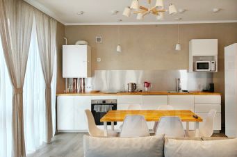 Наш дом — это уютная 2-этажная блок-секция (разновидность таунхауса) в пригороде курортного Светлогорска с большой, оборудованной необходимой техникой (плита, духовой шкаф, холодильник, микроволновая печь, ПММ) и посудой кухней-гостиной с ТВ-зоной и просторным санузлом с душем на 1-ом этаже и двумя изолированными спальнями и ванной комнатой с ванной и окном на 2-ом этаже. В одной из спален — двухспальная кровать, в другой — двухъярусная кровать и раскладной двухспальный диван. Таким образом, в спальнях могут разместиться 5 человек. Раскладной диван в гостиной может стать дополнительным спальным местом для 2-ух человек. Нашим гостям предоставляются свежие полотенца и постельное бельё, фен, гладильная доска и утюг, Wi-Fi. Дом с небольшой придомовой территорией находится за городом, ближайшая остановка автобуса — в 57 минутах ходьбы, вокзал — в 20 минутах. До живописного Тихого озера — около получаса прогулки через зелёный парк, до побережья Балтийского моря — около 45 минут. В сезон мы можем предложить прокат 2-х велосипедов, во дворе есть возможность для размещения небольшого мангала. Рядом с домом — магазины, SPA-центр, ФОК, итальянское кафе и пиццерии. Наш дом предназначен для взрослых и детей от 7 лет, мы вынуждены отказать в размещении маломобильных гостей, детей до 7 лет и любых животных. К заселению не допускаются лица в алкогольном, наркотическом или ином изменённом состоянии, а также лица, не указанные в бронировании. Курение внутри дома категорически запрещено, как и проведение шумных мероприятий. При нарушении условий проживания обеспечительный платёж не возвращается. Доступ в дом осуществляется бесконтактным путём, в соответствии с правилами оплаты и при подтверждении личности гостя.