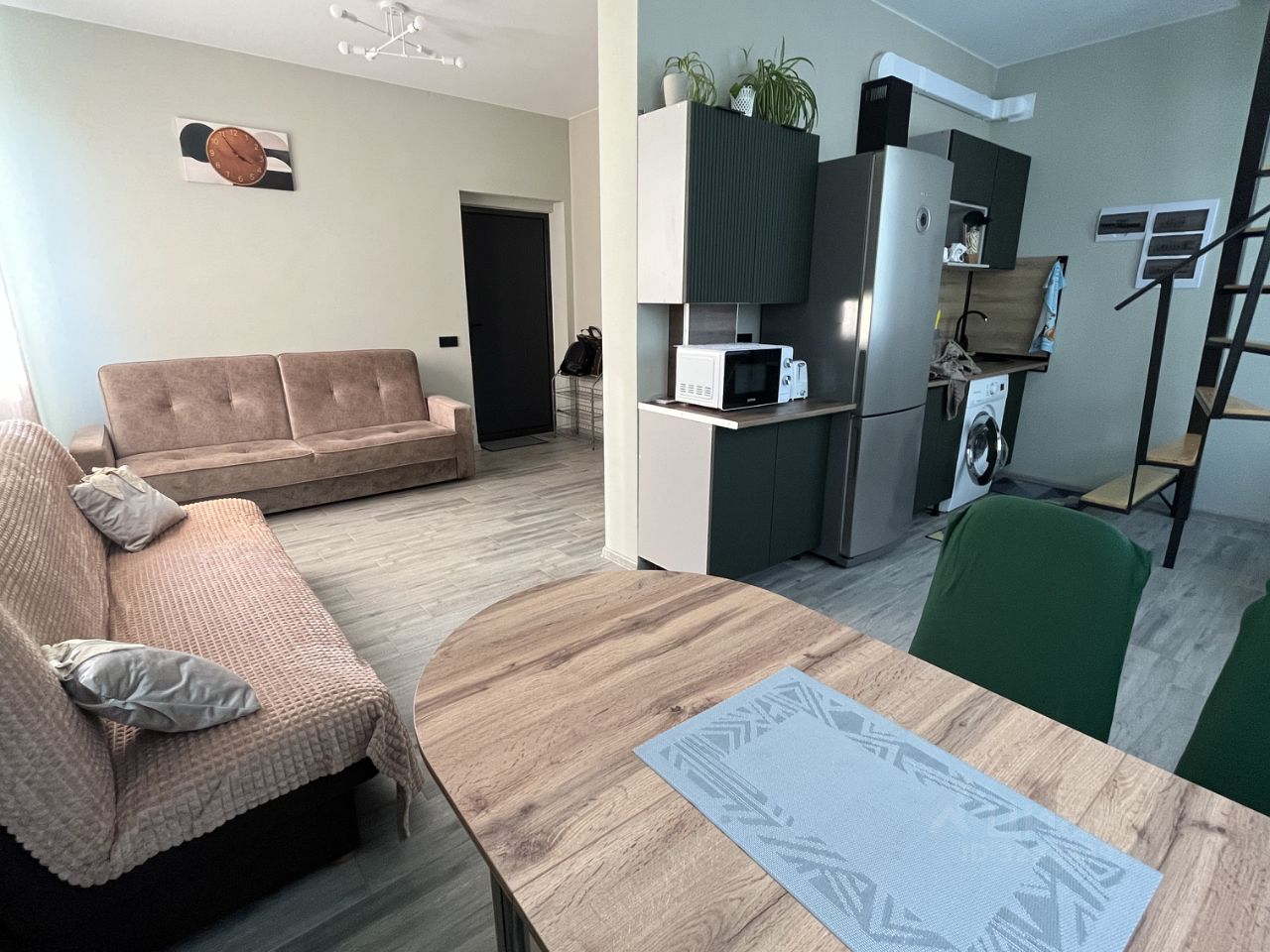 На первом этаже диван-книжка и диван полуторка , можно на нем расположиться вдвоём