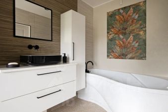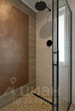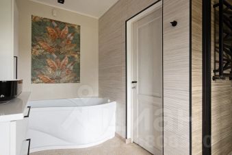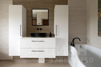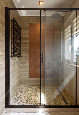 Ванная комната с подогревом пола, оборудованная огромной ванной, двойным освещением и огромной душевой кабиной с видом на озеро. Фен.