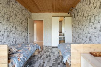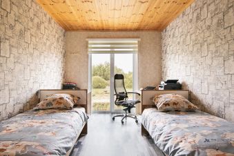 Вторая спальня с двумя одинарными кроватями 200*90. Два больших письменных стола с мфу и беспроводной зарядкой для телефона. Турник и вещевой шкаф. Панорамный вид на пирс и природу:
