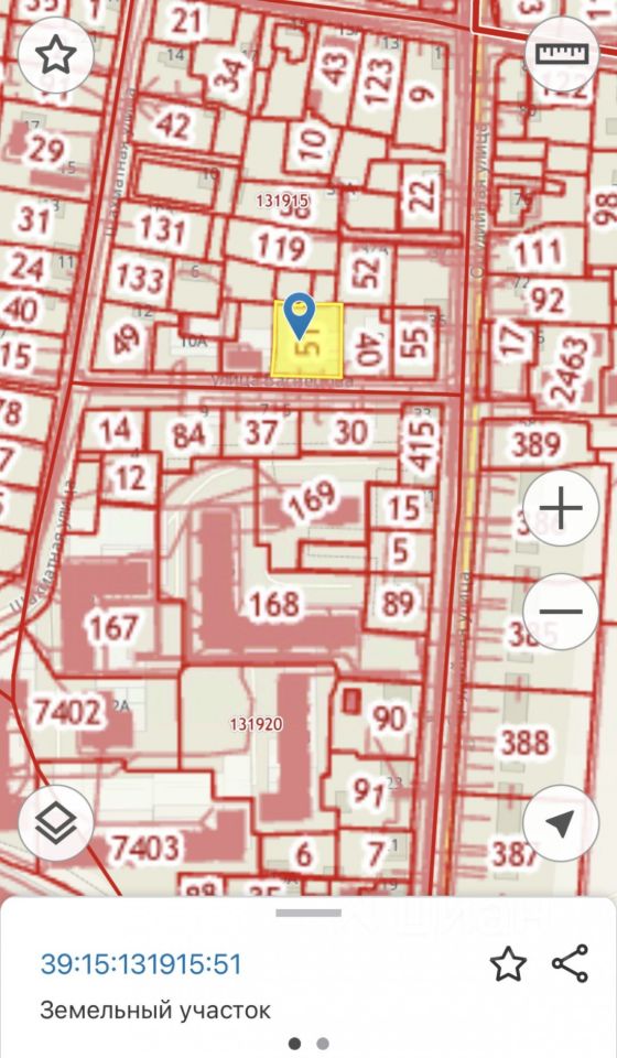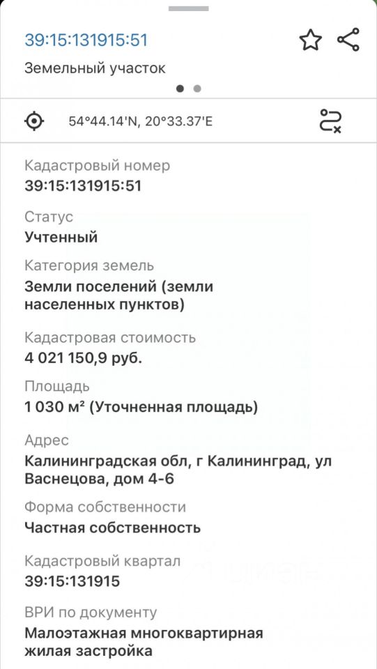Участок общей площадью 10.3 сотки расположен на первой линии улицы Васнецова. Категория земель - земли поселений (земли населенных пунктов), вид разрешенного использования - малоэтажная многоквартирная жилая застройка.