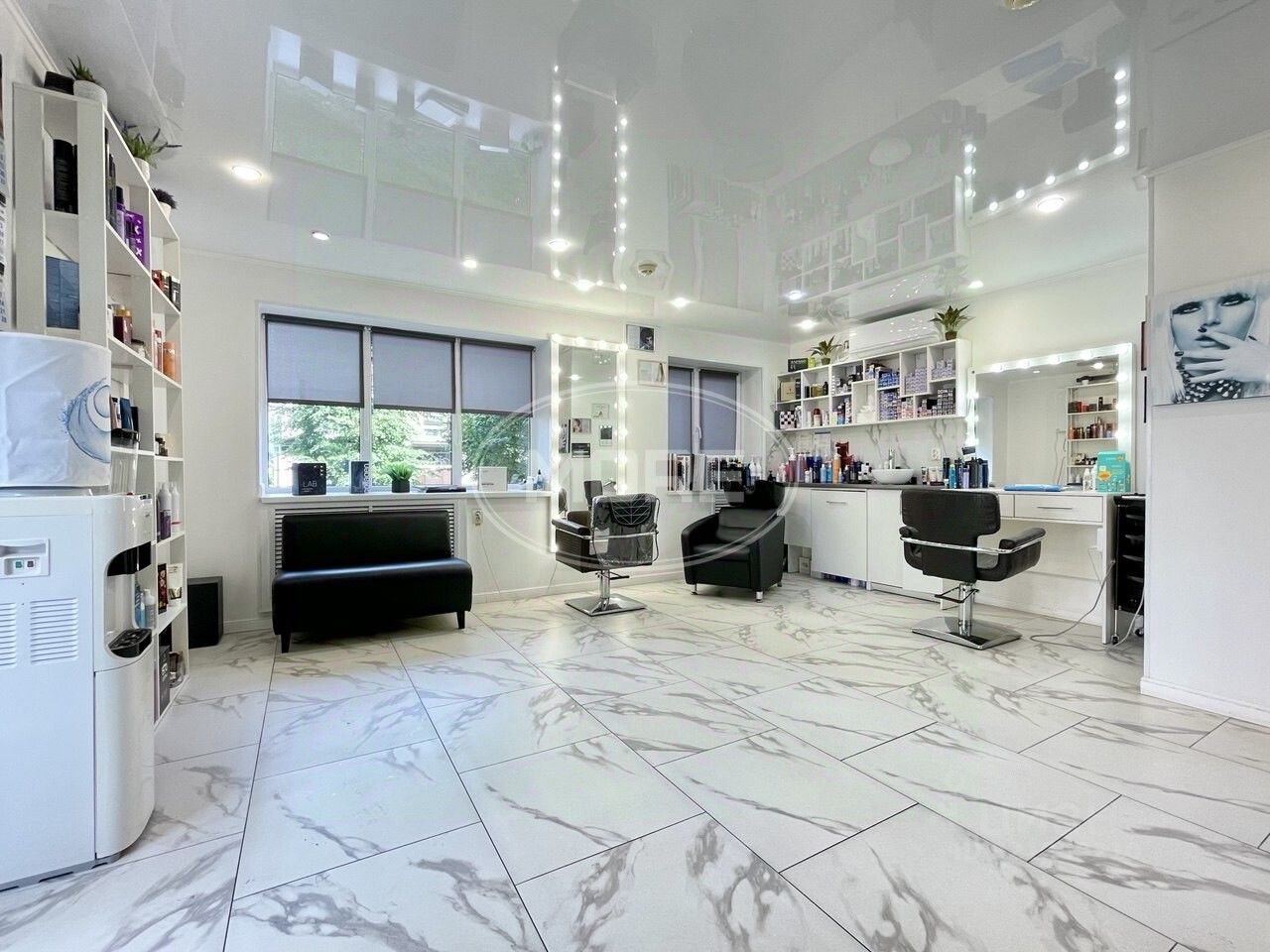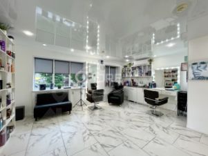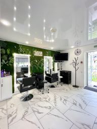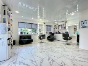 Укомплектованы 4 рабочие зоны для парикмахеров: 4 кресла, зеркала с подсветкой, тумбы, шкафы, стеллажи с рабочей поверхностью и раковиной, мойка парикмахерская с креслом.