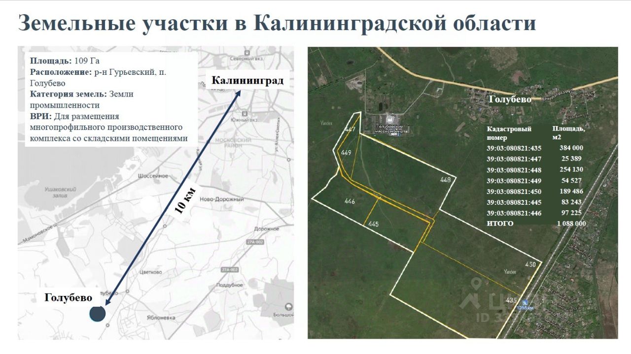 Реализуются единым лотом 7 земельных участков для размещения многопрофильного производственного комплекса со складскими помещениями. Участки смежные и свободны от каких-либо построек. Адрес: Калининградская обл. , Гурьевский р-н, п. Голубево. Общая площадь участков: 1 088 000 кв. м Категория земель: земли промышленности; Разрешенное использование: для размещения многопрофильного производственного комплекса со складскими помещениями. Форма права: собственность Коммуникации: требуют подведения. Зонирование по Генплану: производственная зона. Зонирование по ПЗЗ: П-5 зона производственных и коммунально-складских объектов, расположенных вне границ населенных пунктов. Местоположение и транспортная доступность: Земельный участок расположен в пос. Голубево у ж/д станции "1298 км". До основной дороги около 800 м. Проход и проезд к участку свободный, осуществляется по асфальтовой дороге, частично грунтовой. До исторического центра Калининграда около 10 км. Участок возможно использовать в качестве размещения на нем производственно-складского комплекса.