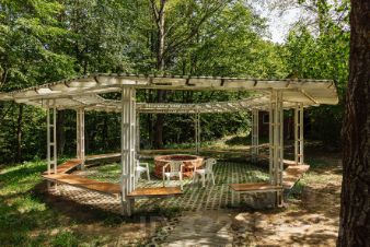 - подсобные помещения и вся необходимая досуговая инфраструктура: качели, лавочки, беседки, дорожки, ведущие к озерам; пергола с кострищем отличное место для посиделок у огня; сцена, позволяющая организовать выступление артистов и т.д.