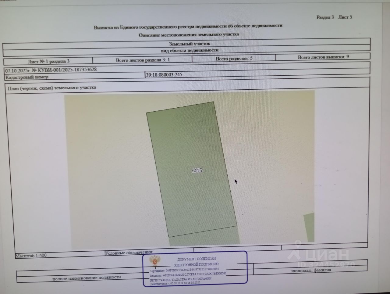 право собственности земельного участка с КН 39:18:080003:245