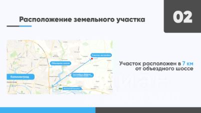 Продается земельный участок площадью 41 Га, расположенный вблизи поселка Сазоновка Гурьевского района Калининградской области, земли промышленности, для размещения производственно-складского комплекса. Есть презентация современного складского комплекса. До окружной дороги города Калининград 7 км, подъезд - асфальтированная дорога. По границе участка проходит ЛЭП, газ высокого давления -по территории участка. Земля в собственности, границы установлены. Готовы рассмотреть различные варианты сотрудничества.