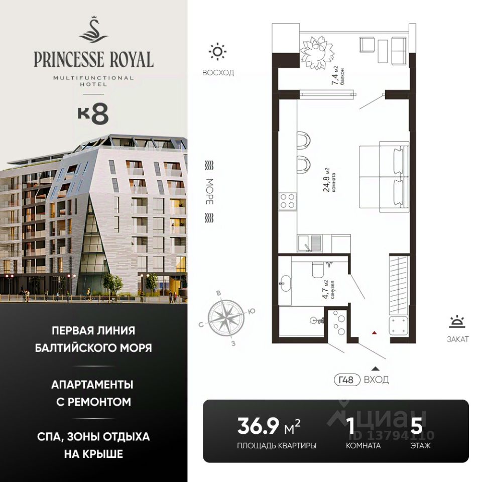 ПРИНЦЕСС РОЯЛ (PRINCESSE ROYAL) Эксклюзивные апартаменты на первой линии в Зеленоградске Элитный мультифункциональный отель "PRINCESSE ROYAL" расположился в курортном Зеленоградске, прямо на променаде Балтийского моря. В продаже апартаменты на 5-7 этажах. Апартаменты будут реализованы только с дизайнерским ремонтом и в полной комплектации. После ввода объекта, недвижимость можно будет отдать под управление профессиональной управляющей компании и извлекать пассивный доход. Из каждого апартамента открывается завораживающий вид на Балтийское море. Панорамное остекление позволяет наслаждаться морскими пейзажами и закатами, не выходя из дома, а продуманная планировка делает пространство максимально функциональным. Срок сдачи - 3 квартал 2027 года. На территории комплекса расположатся: отель, оздоровительный SPA-комплекс с открытыми и закрытыми бассейнами, комплекс бань, семейный ресторан на первом этаже, ресторан высокой кухни на эксплуатируемой кровле, магазины,конференц-зал, спортзал, источники с лечебно-столовой минеральной водой, поступающей из скважин Королевы Луизы. В зоне ресепшн для вашего комфортного пребывания будет работать сервис 24/7, предоставляющий полный спектр услуг. Подземный паркинг будет сдаваться в аренду. "PRINCESSE ROYAL" окружает безупречная инфраструктура! Сделайте шаг из дома — и вы на променаде, сразу же спуск к морю. Всего 3 минуты неспешной прогулки — и вы в сердце Зеленоградска. На автомобиле: 5 мин до Куршской косы, 20 мин до аэропорта Храброво, 30 мин до центра Светлогорска, 35 мин до центра Калининграда. Покупка происходит посредством заключения договора долевого участия. Действует классическая программа ипотеки, рассрочка от застройщика или 100% оплата за собственные средства. Помощь с оформлением сделки от ипотечного брокера и юристов застройщика. Больше подробностей вы можете узнать по телефону отдела продаж. Звоните! Не является публичной офертой, предложение ограничено, оценивайте свои финансовые возможности и риски. Застройщик: ООО СЗ Компас. Проектная декларация размещена на сайте наш.дом.рф. Сроки, условия проведения акций и актуальные цены на сайте девелопера. Когда вы выбираете недвижимость от К8 — вы выбираете комфортную, продуманную и растущую в цене среду для жизни или инвестиций. Что вы получаете: 1. Недвижимость, которая дорожает: каждый проект создаётся так, чтобы его ценность росла. Вы покупаете актив, который работает на вас. 2. Продуманные концепции: вы живете в пространстве с идеей, смыслом и логикой - где каждая деталь служит вашему удобству. 3. Настоящий комфорт: планировки, которые экономят место и время. Дома, где технические решения подчинены вашему образу жизни. 4. Эстетику, которая радует каждый день: архитектура, на которую приятно смотреть, и окружение, которое радует. 5. Качество, которое чувствуется: материалы, инженерия, благоустройство - вы видите и ощущаете результаты внимательного подхода. 6. Заботу на всех этапах: вам помогают подобрать недвижимость именно под ваши цели