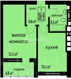 Общая площадь 42.8 кв. м.