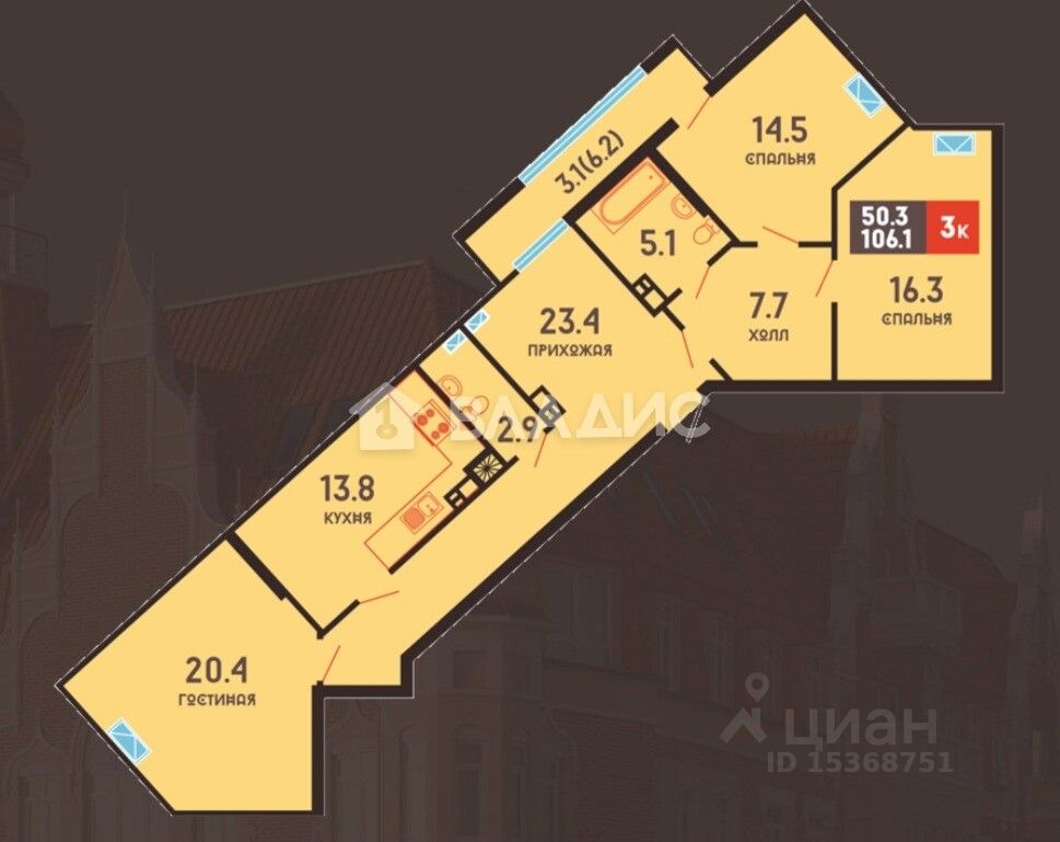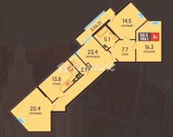 - Площадь: Общая площадь 104.7 кв. м. включает 3 изолированные комнаты и просторную кухню площадью 14 кв. м.