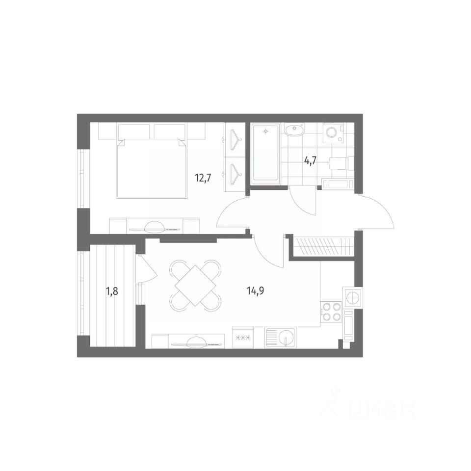 в Дом на Красной от компании ГК "ТРЕСТ". Площадь кухни 14.9 м². Жилой комплекс комфорт-класса "Дом на Красной" расположен в Центральном районе Калининграда на пересечении улиц Красная и Псковская. Жилой комплекс включает в себя два дома высотой 8 этажей. Срок сдачи намечен на 4 квартал 2026 года.