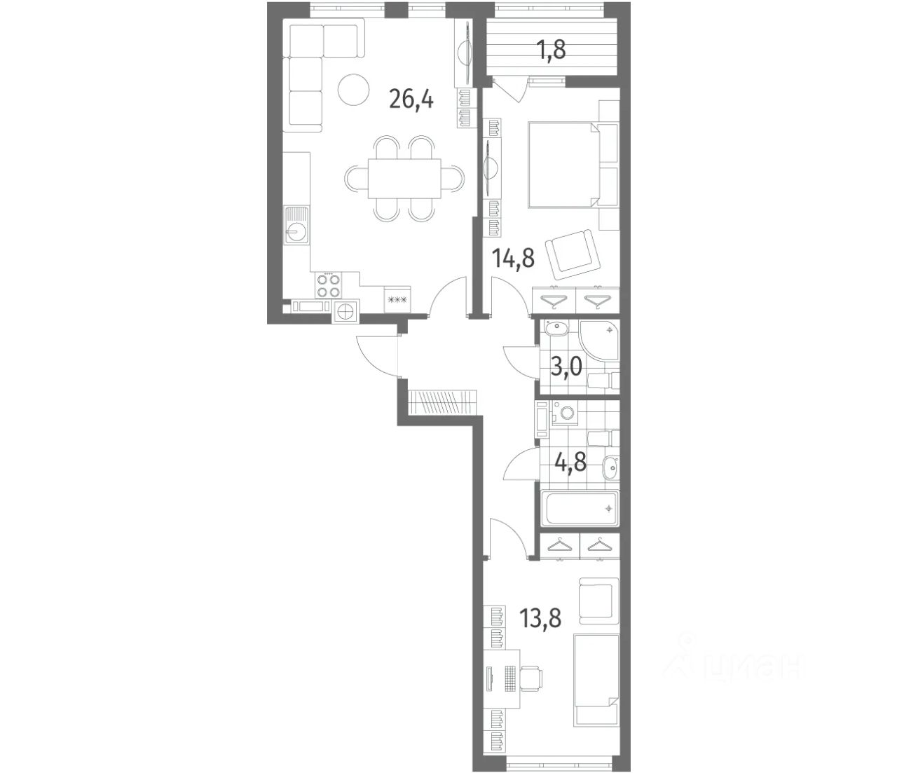 в Дом на Красной от компании ГК "ТРЕСТ". Площадь кухни 26.4 м². Жилой комплекс комфорт-класса "Дом на Красной" расположен в Центральном районе Калининграда на пересечении улиц Красная и Псковская. Жилой комплекс включает в себя два дома высотой 8 этажей. Срок сдачи намечен на 4 квартал 2026 года.