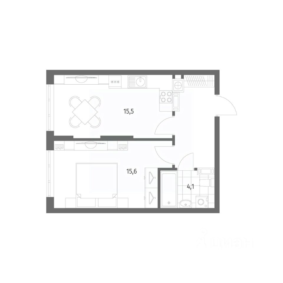в Дом на Красной от компании ГК "ТРЕСТ". Площадь кухни 15.5 м². Жилой комплекс комфорт-класса "Дом на Красной" расположен в Центральном районе Калининграда на пересечении улиц Красная и Псковская. Жилой комплекс включает в себя два дома высотой 8 этажей. Срок сдачи намечен на 4 квартал 2026 года.