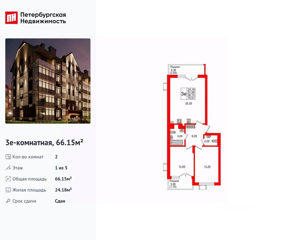 Удобная, классическая, функциональная европланировка, большая кухня-гостиная 25.29 м², вместительная прихожая 6.09 м². Общая площадь квартиры - 66.15 м², жилая 24.18 м², высота потолка 3.01 м.