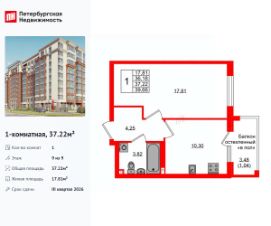 Удобная, классическая планировка, кухня 10.3 м², просторная прихожая 4.25 м². Общая площадь квартиры - 37.22 м², жилая 17.81 м², высота потолка 3 м.