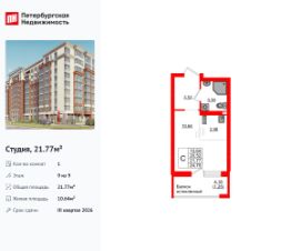Удобная, классическая, функциональная европланировка, большая кухня-гостиная 2.96 м², просторная прихожая 3.53 м². Общая площадь студии - 21.77 м², жилая 10.64 м², высота потолка 3 м.
