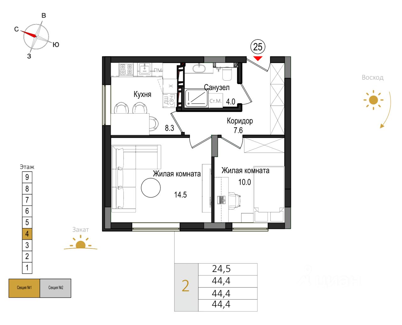 Общая площадь44,4 м²