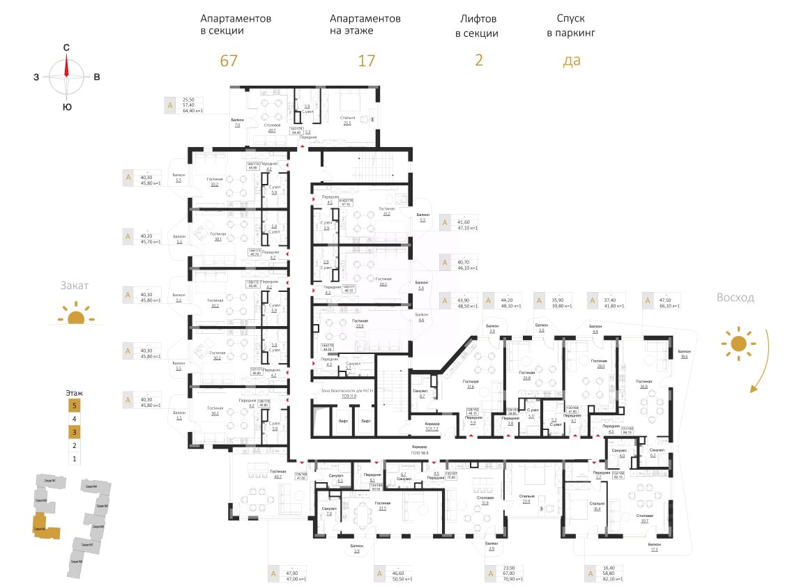 Комлекс состоит из восьми корпусов с различными вариантами планировочных решений от студий площадью 28,5 м2 до апартаментов площадью 82,1 м2 с открытыми террасами. Высота потолков - 3 м. Предусмотрен подземный паркинг на 286 мест.