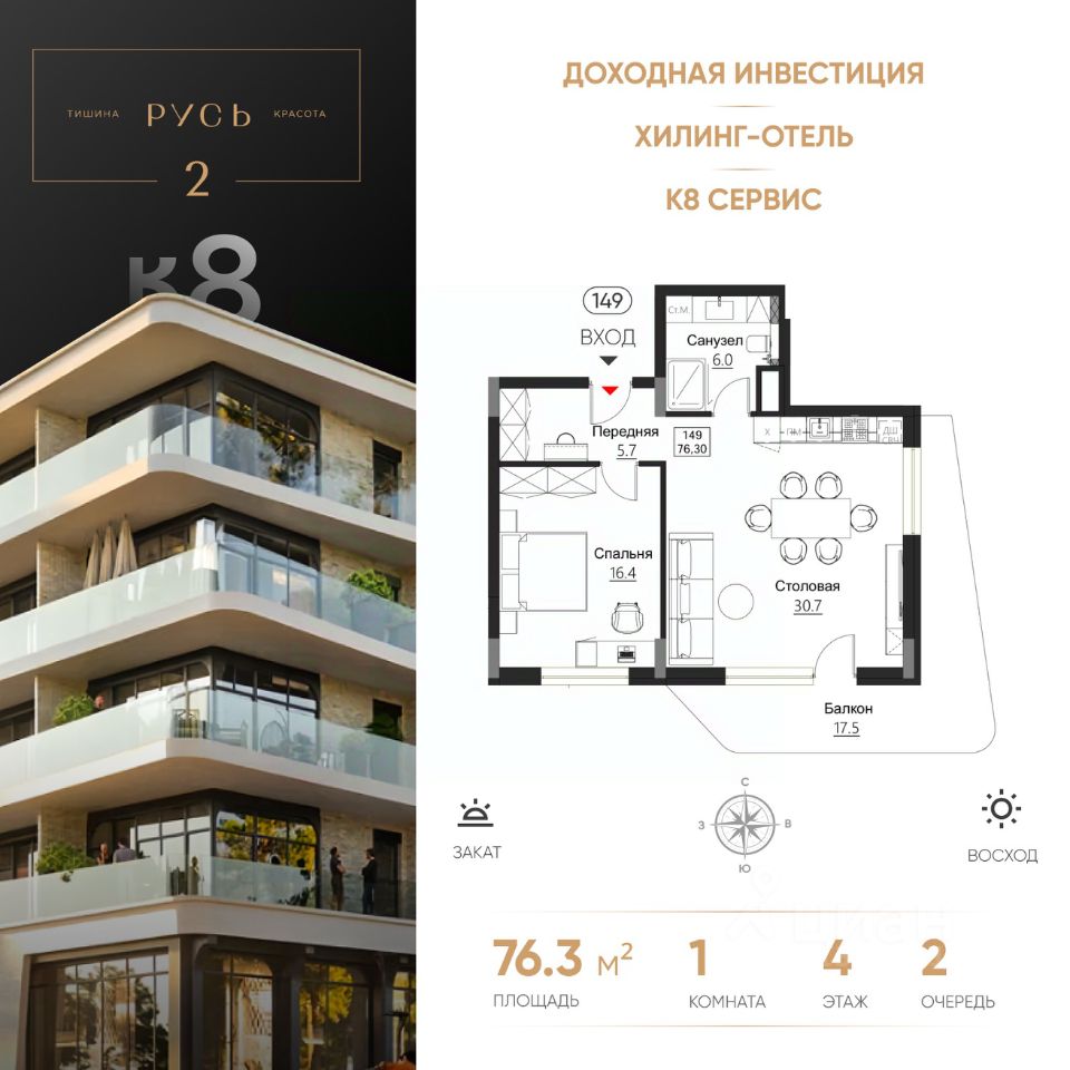 РУСЬ 2 Эксклюзивные апартаменты на побережье Балтийского моря, в Светлогорске Гостиничный комплекс "Русь-2" олицетворяет концепцию хилинг-отеля, созданного для восстановления сил, отдыха, оздоровления на берегу моря. Срок сдачи - 4 квартал 2028 года. Комплекс состоит из восьми корпусов с различными вариантами планировочных решений от студий площадью 28,5 м2 до апартаментов площадью 82,1 м2 с открытыми террасами. Высота потолков - 3 м. Предусмотрен подземный паркинг на 286 мест. В 1 очереди Руси расположится гостиница 5*, поликлиника реабилитационно-восстановительной направленности. Здесь вы найдете идеальный синтез релакса и бережного оздоровления. Особенностью второй очереди является то, что она будет полностью интегрирована с внешней инфраструктурой всего комплекса "Русь". Собственники апартаментов будут иметь возможность, не покидая комплекса, пользоваться всеми услугами СПА, бассейнов, фитнес-залов и хилинг-сервисов с приятным дисконтом. Комплекс окружает безупречная инфраструктура: Конференц-залы, коворкинги, места для работы на открытом воздухе Рестораны с летними террасами и видом на море Авторская концепция благоустройства территории, арт-объекты, озеленение и продуманным освещением Изысканные дизайнерские интерьеры и безупречное обслуживание консьерж-сервиса Апартамент в отделке White Box Для покупателей апартаментов действуют все ипотечные программы, рассрочка от застройщика или 100% оплата за собственные средства. Помощь с оформлением сделки от ипотечного брокера и юристов застройщика. Звоните, готовы ответить на все ваши вопросы в удобное для Вас время! Не является публичной офертой, предложение ограничено, оценивайте свои финансовые возможности и риски. Застройщик: ООО "СЗ Шеф Повар". Проектная декларация размещена на сайте наш.дом.рф. Сроки, условия проведения акций и актуальные цены на сайте девелопера. Когда вы выбираете недвижимость от К8 — вы выбираете комфортную, продуманную и растущую в цене среду для жизни или инвестиций. Что вы получаете: 1. Недвижимость, которая дорожает: каждый проект создаётся так, чтобы его ценность росла. Вы покупаете актив, который работает на вас. 2. Продуманные концепции: вы живете в пространстве с идеей, смыслом и логикой - где каждая деталь служит вашему удобству. 3. Настоящий комфорт: планировки, которые экономят место и время. Дома, где технические решения подчинены вашему образу жизни. 4. Эстетику, которая радует каждый день: архитектура, на которую приятно смотреть, и окружение, которое радует. 5. Качество, которое чувствуется: материалы, инженерия, благоустройство - вы видите и ощущаете результаты внимательного подхода. 6. Заботу на всех этапах: вам помогают подобрать недвижимость именно под ваши цели: для жизни, отдыха или инвестиций - в Светлогорске, Зеленоградске и Калининграде. 7. Возможность стабильного дохода: вы получаете доступ к курортной недвижимости с высокой инвестиционной привлекательностью доходностью выше рынка. 8. Сообщество единомышленников: комфортная среда, и