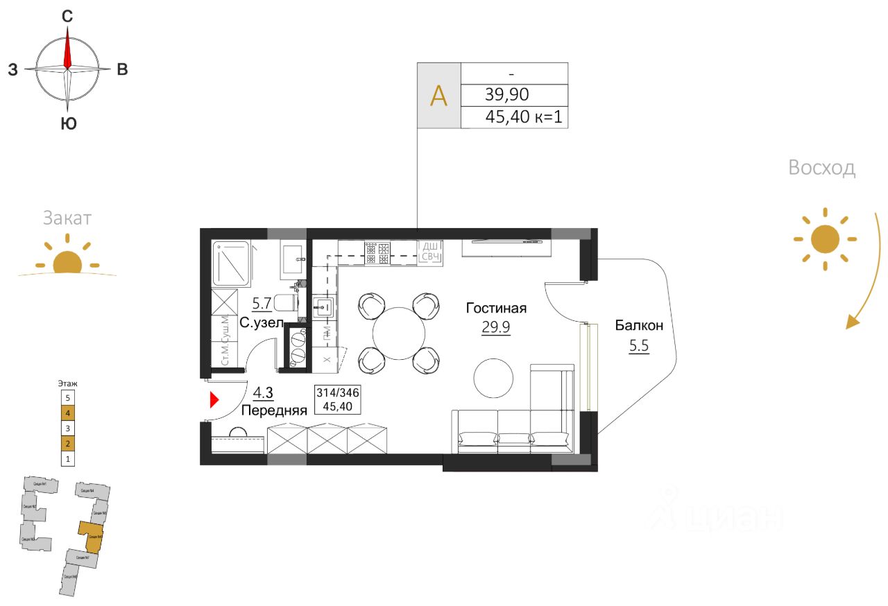 Комлекс состоит из восьми корпусов с различными вариантами планировочных решений от студий площадью 28,5 м2 до апартаментов площадью 82,1 м2 с открытыми террасами. Высота потолков - 3 м. Предусмотрен подземный паркинг на 286 мест.