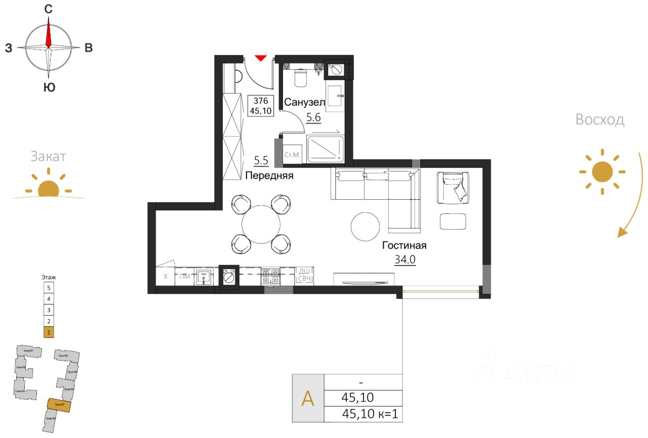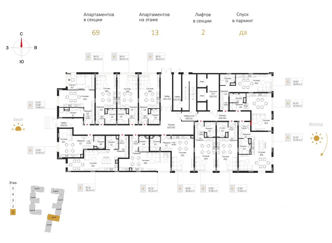 Комлекс состоит из восьми корпусов с различными вариантами планировочных решений от студий площадью 28,5 м2 до апартаментов площадью 82,1 м2 с открытыми террасами. Высота потолков - 3 м. Предусмотрен подземный паркинг на 286 мест.