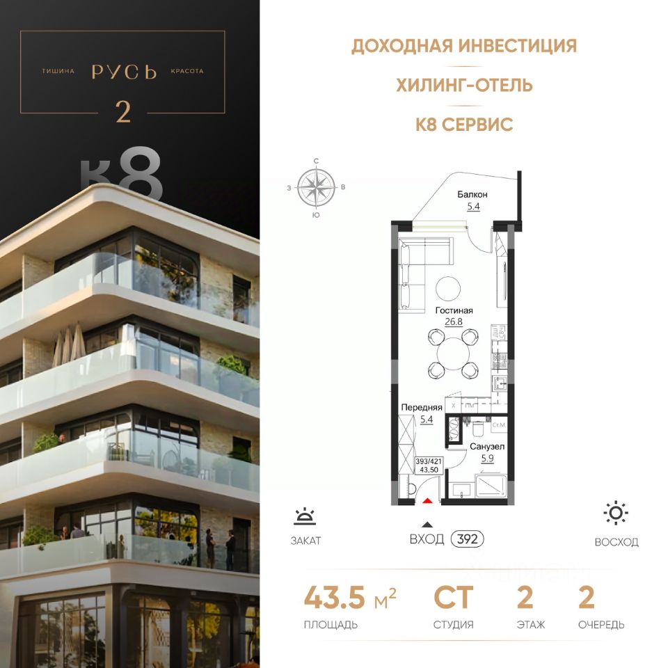 Акция КВАРТИРНИК К8.Цена действует при 100% оплате (в т.ч. ипотекой без субсидирования) или рассрочке до 6 месяцев и первоначальном взносе от 50%. Срок действия акции с 18.11.26-07.02.26. Акция не суммируется ни с какими другими акциями на сайте. РУСЬ 2 Эксклюзивные апартаменты на побережье Балтийского моря, в Светлогорске Гостиничный комплекс "Русь-2" олицетворяет концепцию хилинг-отеля, созданного для восстановления сил, отдыха, оздоровления на берегу моря. Срок сдачи - 4 квартал 2028 года. Комплекс состоит из восьми корпусов с различными вариантами планировочных решений от студий площадью 28,5 м2 до апартаментов площадью 82,1 м2 с открытыми террасами. Высота потолков - 3 м. Предусмотрен подземный паркинг на 286 мест. В 1 очереди Руси расположится гостиница 5*, поликлиника реабилитационно-восстановительной направленности. Здесь вы найдете идеальный синтез релакса и бережного оздоровления. Особенностью второй очереди является то, что она будет полностью интегрирована с внешней инфраструктурой всего комплекса "Русь". Собственники апартаментов будут иметь возможность, не покидая комплекса, пользоваться всеми услугами СПА, бассейнов, фитнес-залов и хилинг-сервисов с приятным дисконтом. Комплекс окружает безупречная инфраструктура: Конференц-залы, коворкинги, места для работы на открытом воздухе Рестораны с летними террасами и видом на море Авторская концепция благоустройства территории, арт-объекты, озеленение и продуманным освещением Изысканные дизайнерские интерьеры и безупречное обслуживание консьерж-сервиса Апартамент в отделке White Box Для покупателей апартаментов действуют все ипотечные программы, рассрочка от застройщика или 100% оплата за собственные средства. Помощь с оформлением сделки от ипотечного брокера и юристов застройщика. Звоните, готовы ответить на все ваши вопросы в удобное для Вас время! Не является публичной офертой, предложение ограничено, оценивайте свои финансовые возможности и риски. Застройщик: ООО "СЗ Шеф Повар". Проектная декларация размещена на сайте наш.дом.рф. Сроки, условия проведения акций и актуальные цены на сайте девелопера. Когда вы выбираете недвижимость от К8 — вы выбираете комфортную, продуманную и растущую в цене среду для жизни или инвестиций. Что вы получаете: 1. Недвижимость, которая дорожает: каждый проект создаётся так, чтобы его ценность росла. Вы покупаете актив, который работает на вас. 2. Продуманные концепции: вы живете в пространстве с идеей, смыслом и логикой - где каждая деталь служит вашему удобству. 3. Настоящий комфорт: планировки, которые экономят место и время. Дома, где технические решения подчинены вашему образу жизни. 4. Эстетику, которая радует каждый день: архитектура, на которую приятно смотреть, и окружение, которое радует. 5. Качество, которое чувствуется: материалы, инженерия, благоустройство - вы видите и ощущаете результаты внимательного подхода. 6. Заботу на всех этапах: вам помогают подобрать недвижимость именно под ваши цели: для жизни, отдыха или инвестици