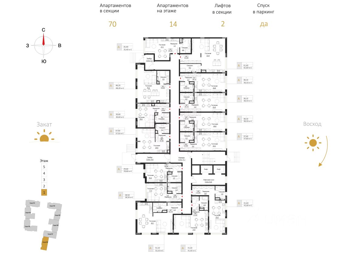 Комлекс состоит из восьми корпусов с различными вариантами планировочных решений от студий площадью 28,5 м2 до апартаментов площадью 82,1 м2 с открытыми террасами. Высота потолков - 3 м. Предусмотрен подземный паркинг на 286 мест.