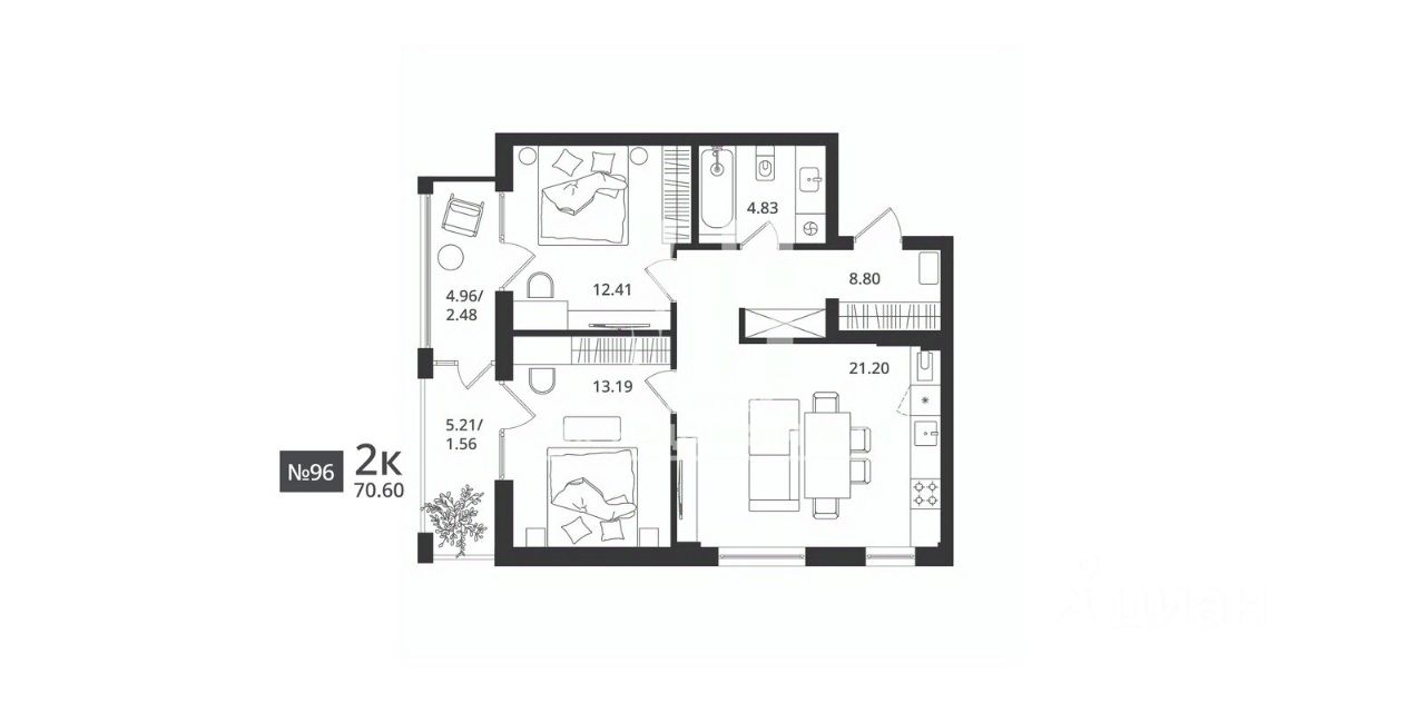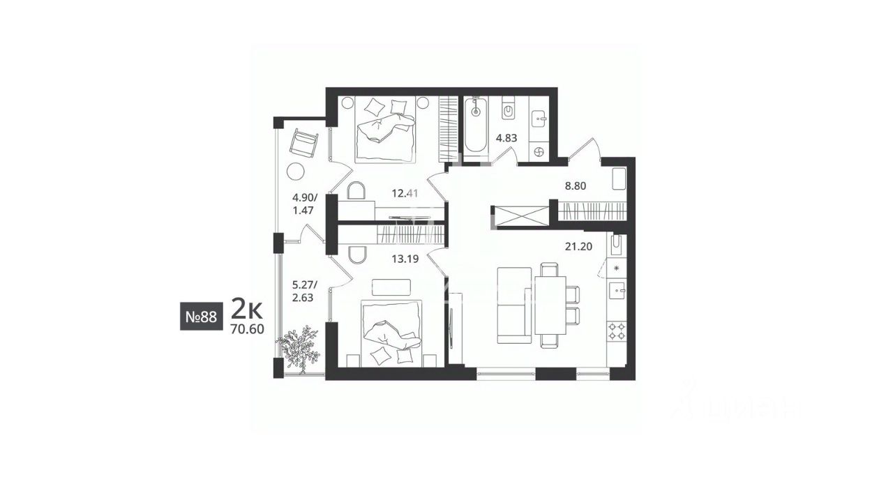 • 2-е спальни площадью 13,19 и 12,41 кв.м.