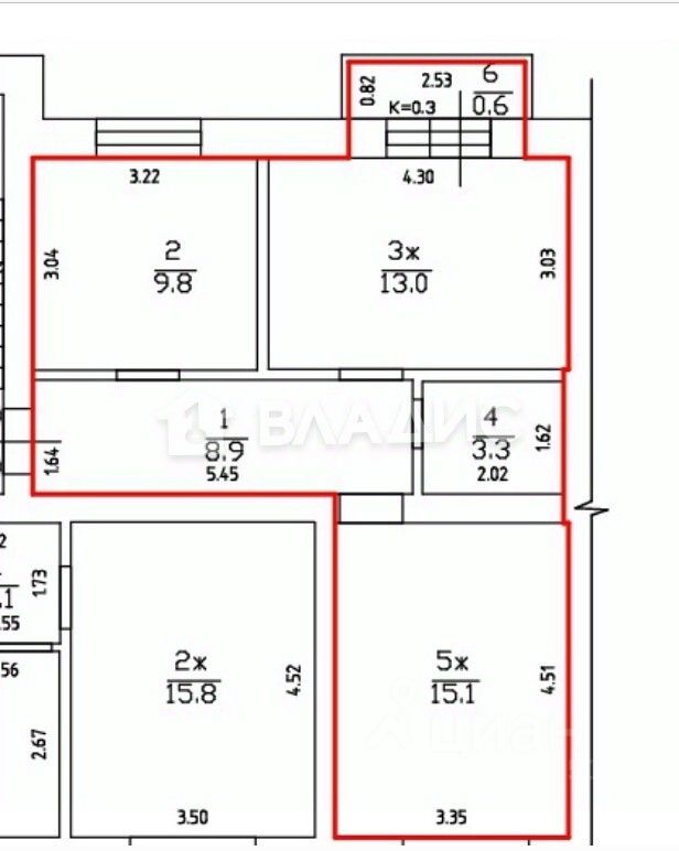 Жилая  28.1 кв.м изолированные комнаты 15.1/13 кв.м с выходом на застекленный балкон