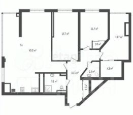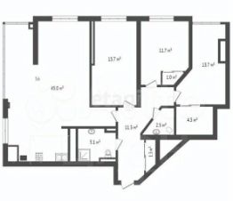 Квартира расположена на 16-ом этаже. В квартире 2 сан.узла (2,5 + 5,1 м²), кухня-гостиная (45 м²), 3 изолированные спальни (15,7 + 11,7 + 13,7 м²) так же в одной из спален есть гардеробная (4,3 м²).