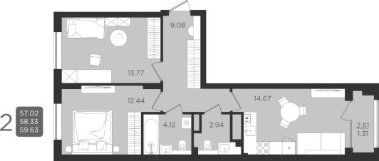 двухкомнатные от 60м2, трехкомнатные от 70м2.