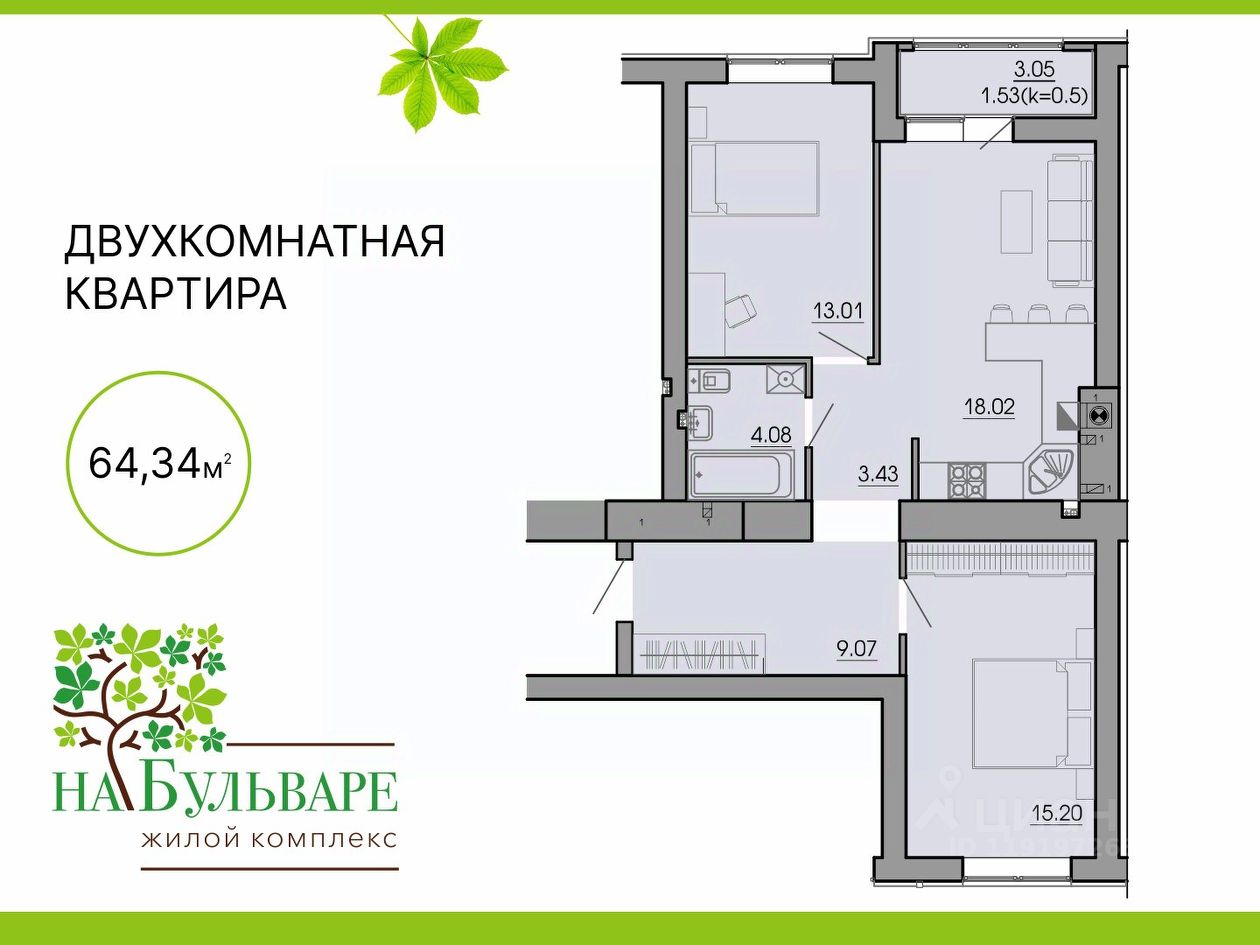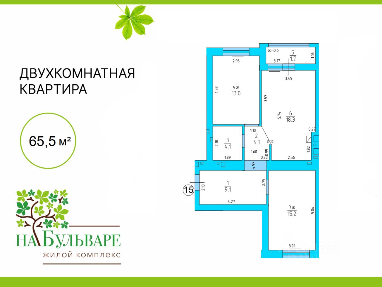 Продаётся 2-комнатная квартира в строящемся доме (Дом 1), срок сдачи: IV-кв. 2025, общей площадью 65.86 кв.м., на 2 этаже.